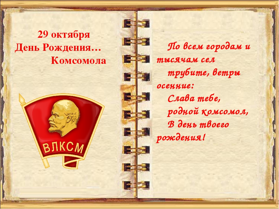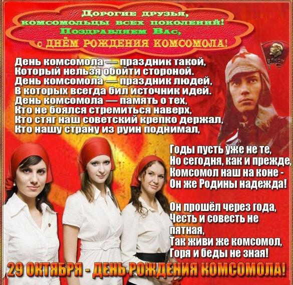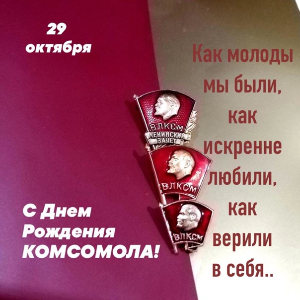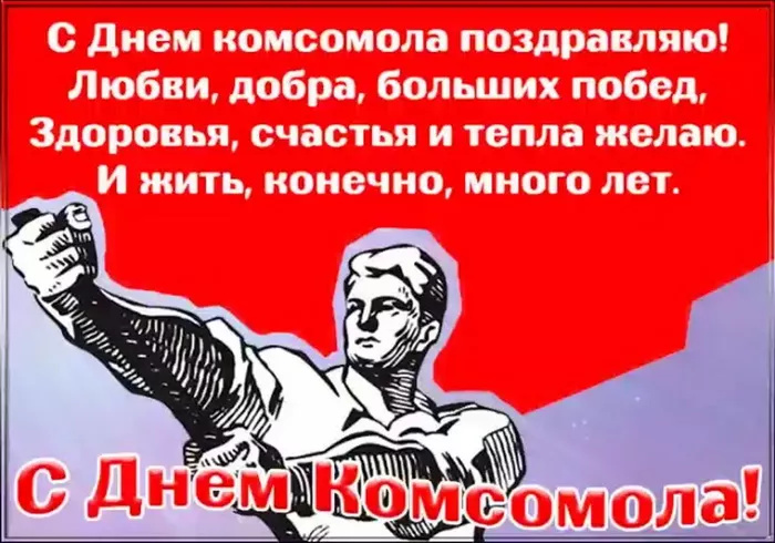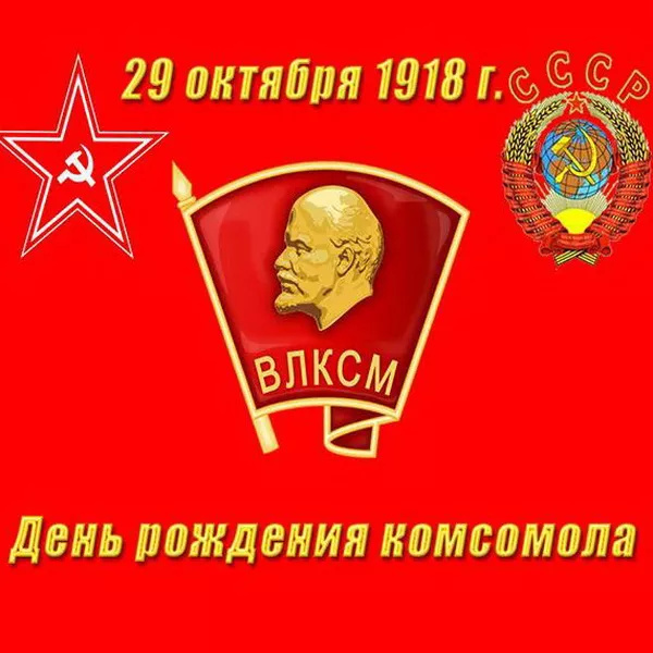 29 октября отмечается День рождения комсомола. Предлагаем Вам большую коллекцию красивых открыток и картинок с Днем комсомола. Вы можете бесплатно скачать открытку с поздравлениями или картинку с надписями и отправить её своим близким, друзьям или коллегам через социальные сети («Одноклассники», «ВКонтакте») или мессенджеры (WhatsApp, Telegram, Viber).